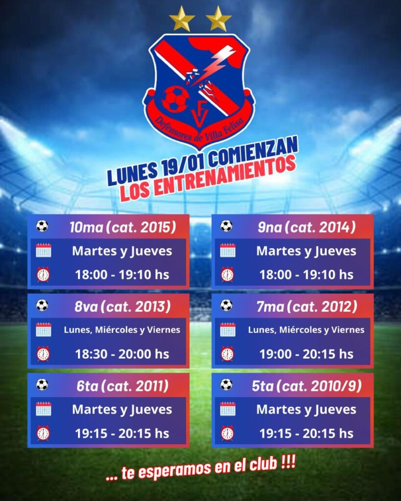 El próximo lunes 19 de enero, el Club Defensores de Villa Felisa, de la ciudad de San Lorenzo, dará inicio a los entrenamientos de sus categorías juveniles, marcando el comienzo de una nueva etapa deportiva.
