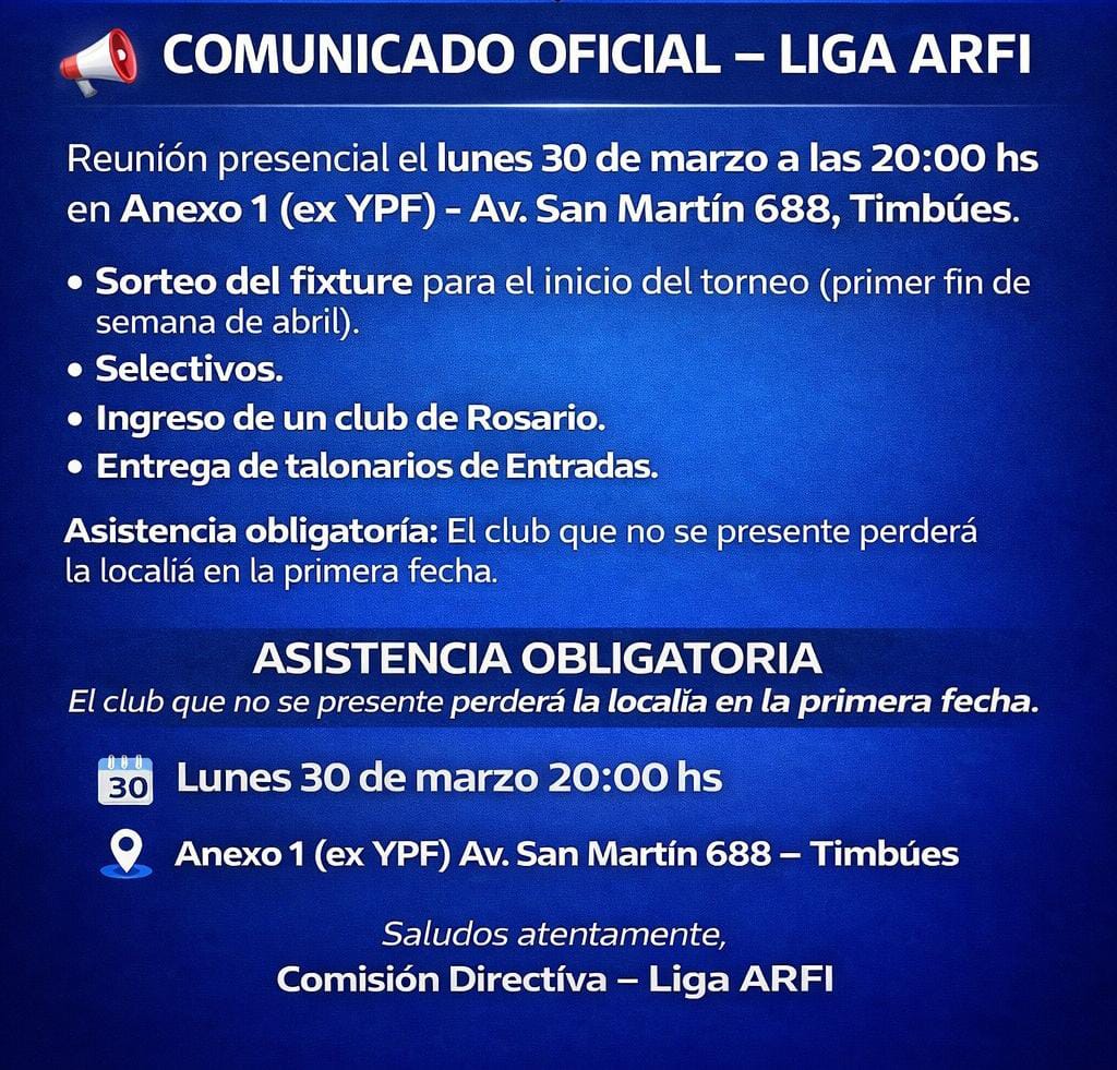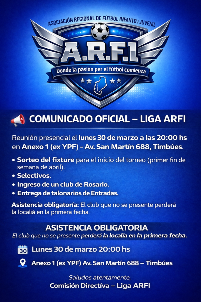 La Asociación Regional de Fútbol Infantil (ARFI) informó que el próximo lunes 30 de marzo, a las 20:00, realizará una reunión presencial en Anexo 1 (ex YPF), ubicado en Av. San Martín 688 de la localidad de Timbúes.